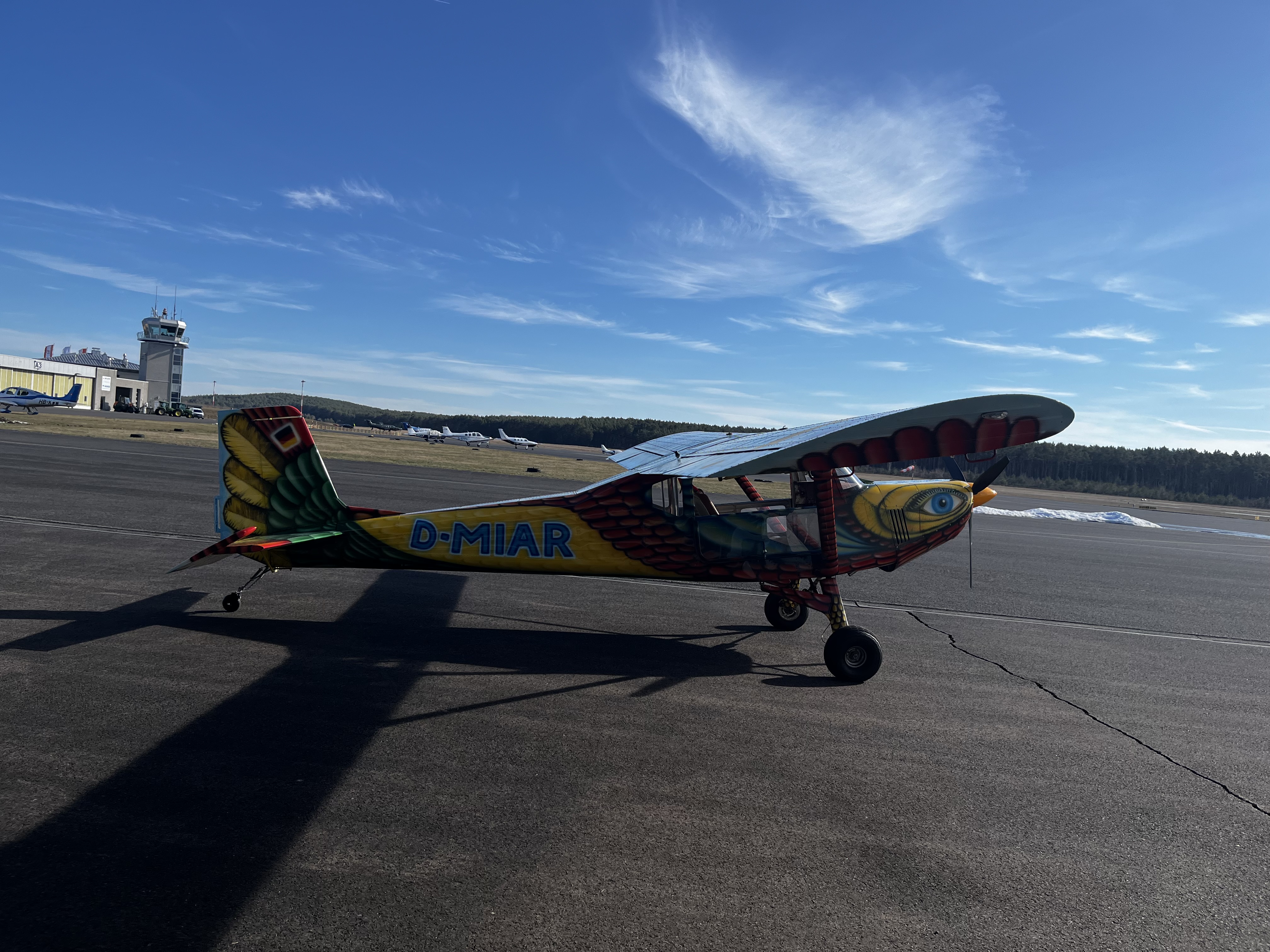 Dieses besondere Flugzeug wurde im Jahr 2001 erstmals zugelassen und anschließend vom Künstler Reinhold Albert aufwändig im einzigartigen Paradiesvogel-Design gestaltet. Das farbenprächtige Kunstwerk macht diese WT-01 zu einem echten Unikat und Sammlerstück.