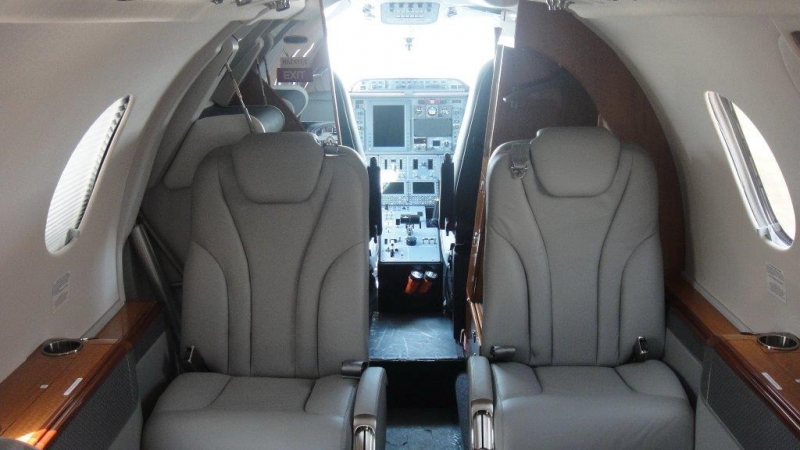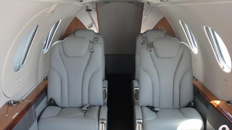 6 passenger interior in Parchment leather. High gloss Premier Ebony laminate cabinetry with Pewter accessories. Tumbleweed Shimmer fabric headliner with River Sand Marshall fabric upper sidewalls and Parchment leather lower sidewalls. Bronze mirrored aft partitions. Aft toilet.